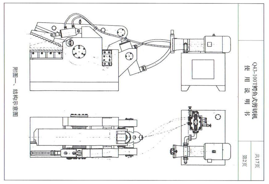 金屬剪切機由液壓裝置提供動力,驅(qū)動液壓缸推動拉力桿,通過主動刀與定刀的上下咬合剪斷力,實現(xiàn)對金屬材料的剪切工作。結(jié)構(gòu)如下圖: